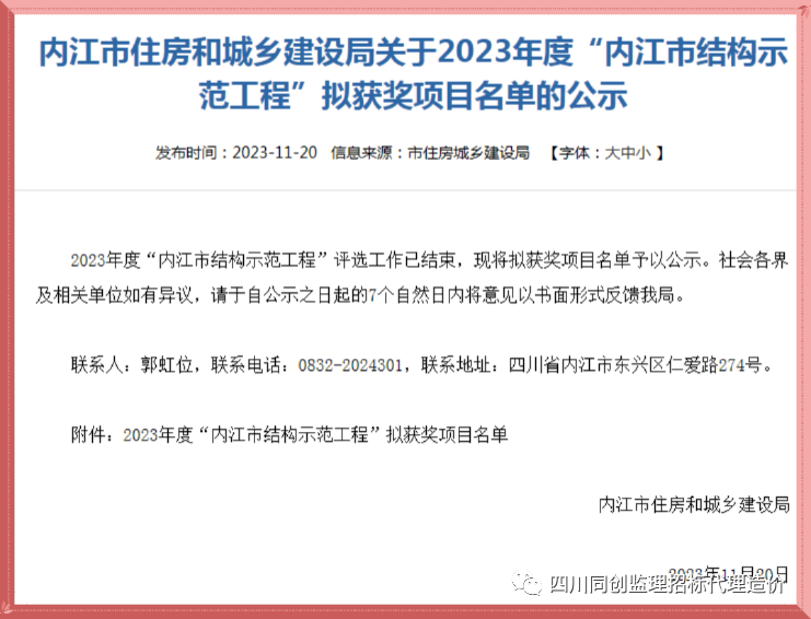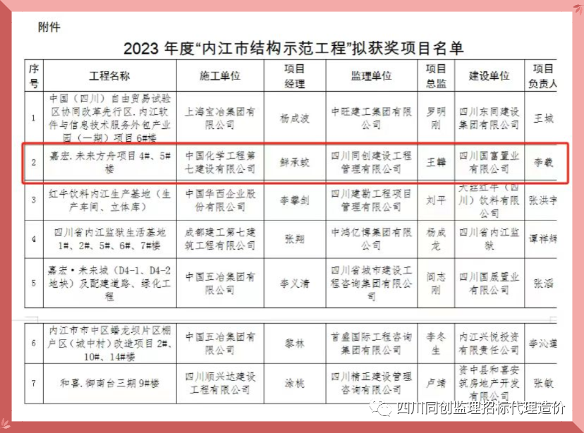 近日,內(nèi)江市住房和城鄉(xiāng)建設(shè)局公布了2023年度內(nèi)江市“結(jié)構(gòu)示范工程”獲獎(jiǎng)工程名單,四川同創(chuàng)建設(shè)工程管理有限公司監(jiān)理的“嘉宏.未來方舟項(xiàng)目4#、5#樓”項(xiàng)目榜上有名,這一榮譽(yù)不僅是對項(xiàng)目團(tuán)隊(duì)辛勤付出的肯定,也是對四川同創(chuàng)建管監(jiān)理工作的高度認(rèn)可。